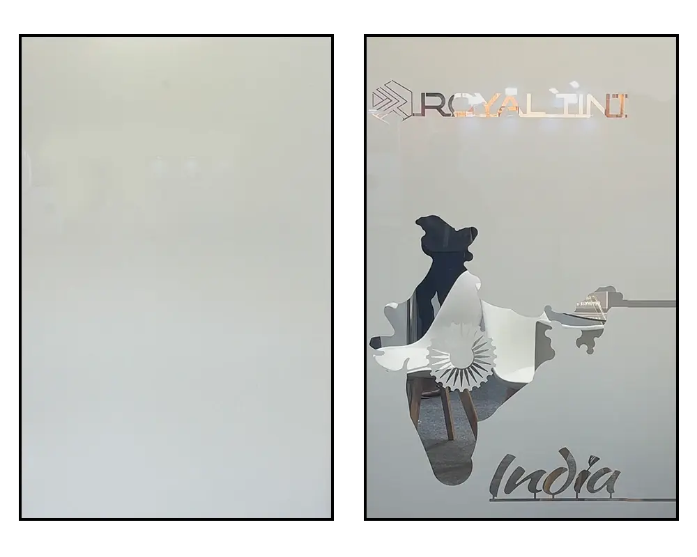 Royal Tint’s Etched Switchable Film – Limited Edition Series is a breakthrough in glass technology that fuses privacy control with personalized design. Unlike traditional smart films, this premium series allows you to embed customized visuals—such as company logos, slogans, patterns, or artworks—directly inside the switchable layer. The result is a glass surface that dynamically transitions between clear and opaque, while your custom design appears or disappears based on the power state. It offers a refined way to express identity, enhance branding, or create signature aesthetics in any space.